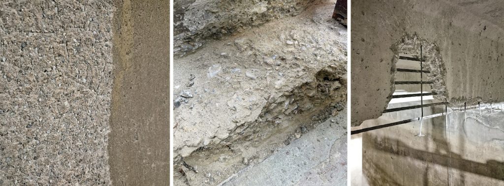 Concrete, an essential material for modern infrastructure, has a history that begins in Antiquity, but its current form developed in the 19th century with the advent of Portland cement. Although it has high initial strength, concrete is subject to degradation due to chemical (carbonation, chlorides), physical (freeze-thaw, shrinkage) and mechanical (impact, vibration) factors. Corrosion of reinforcement is one of the most serious problems, accelerated by the decrease in pH and the expulsion of the coating layer. The restoration of concrete structures requires a correct diagnosis, followed by adapted interventions: local repairs with specialized mortars, crack injections, linings, modern strengthening systems such as FRP or SRP and the application of waterproof coatings.